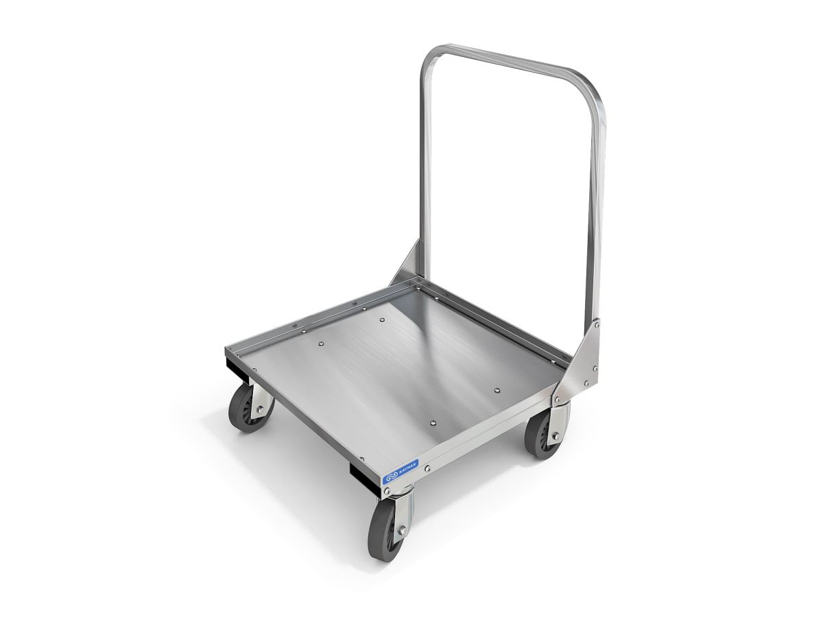 545х538х760мм. Тележка для транспортирования посудомоечных кассет 500х500х100мм, нагрузка 60кг, каркас: нерж. сталь AISI 430, 4 поворотных колеса 2 с тормозом, 2 без.