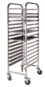 470х620х1735мм, материал нерж.сталь 201, толщина 1мм, 15 направляющих под противни 600*400мм, ширина направляющих 40мм, расстояние между противнями 8см, 4 колеса 5" (2 колеса со стопором), фиксаторы противней с двух сторон, не предназначена для использования внутри камер ротационных печей или камер шоковой заморозки