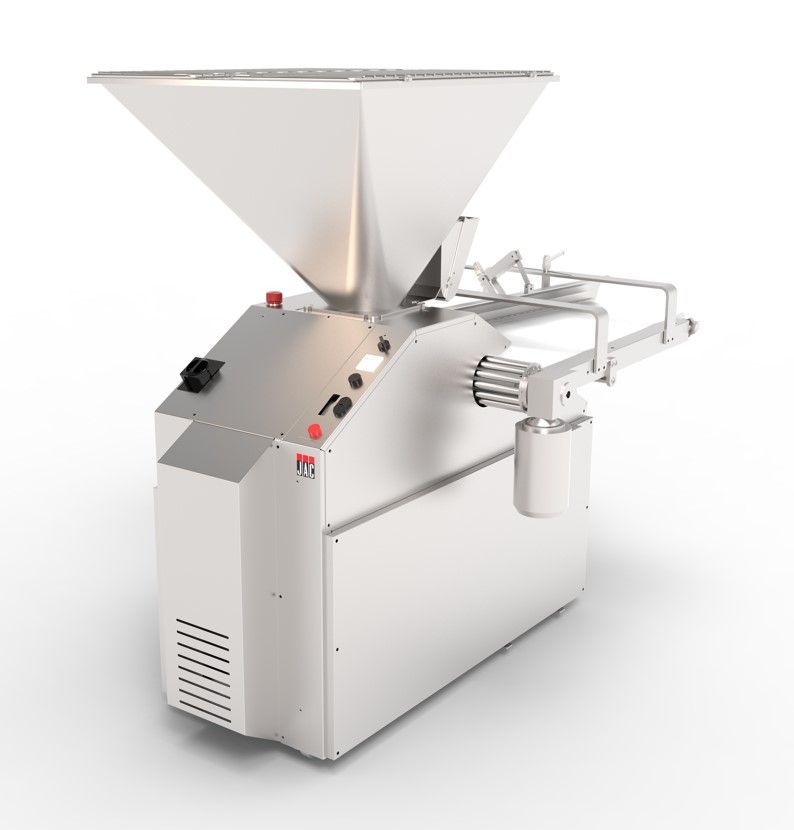 1802х563 (850 ширина бункера)х1701мм, 2,2кВт, 380В, регулируемая скорость, 960-2000 шт/ч, бункер с тефлоновым покрытием на 120кг, поршень 80мм, корпус из нерж. стали