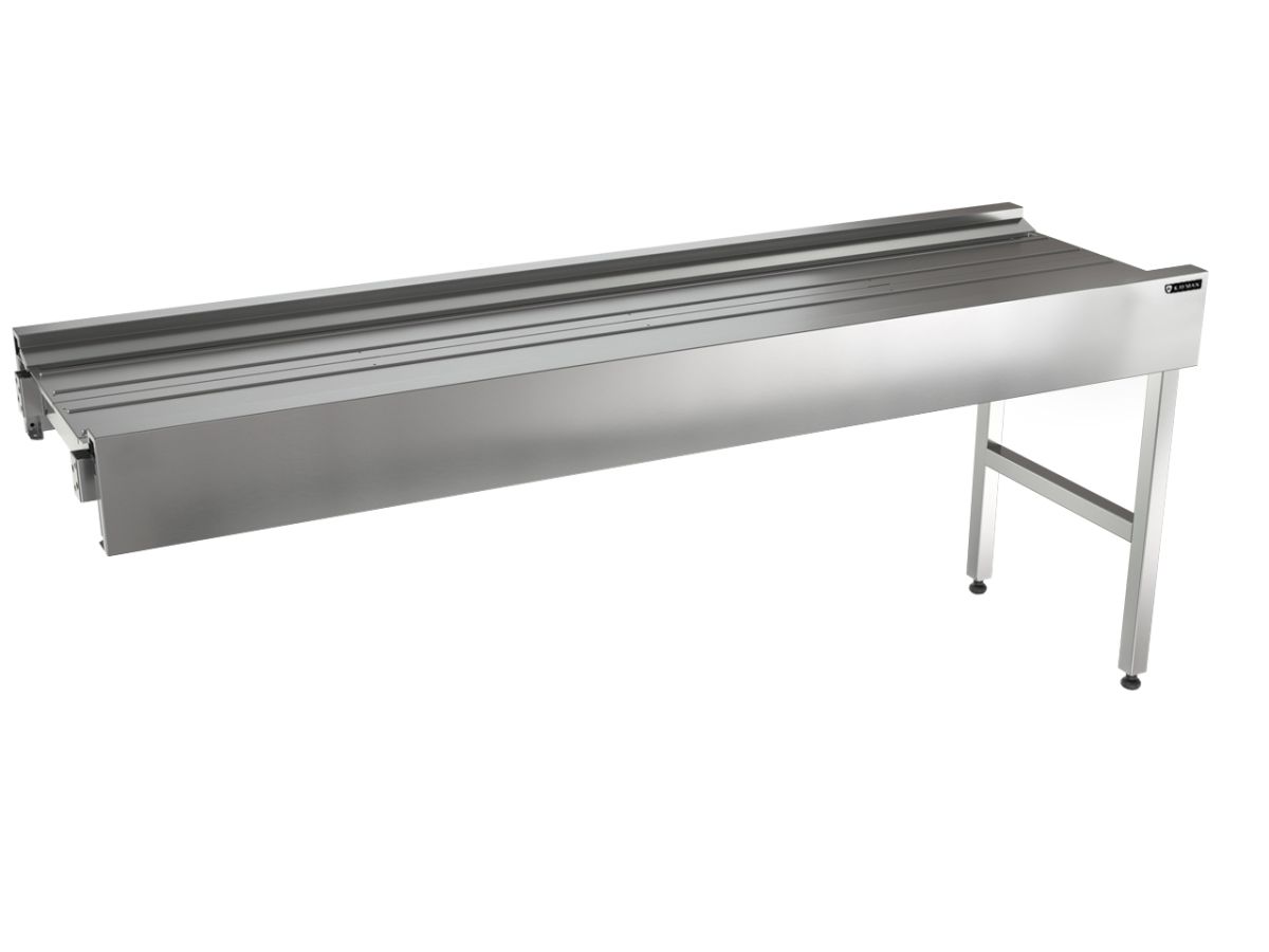 2015х600х850мм, ширина используемой ленты 450мм. Перемещение посуды может осуществляться как поштучно, так и на подносах. Максимальная длина транспортера – до 20 метров.