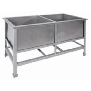 800х430х850мм, Две сварные емкости размером 330х330х300 из нержавещей стали марки AISI 304 толщиной 0,8мм. Каркас сварной из уголка 40х40 толщиной 2мм, покрытого порошковой краской серого цвета, внизу по периметру обвязка. Ванна комплектуется выпуском с нержавеющей решеткой и механическим запорным клапаном, диаметр выпуска 90мм, диаметр подключаемого сифона 50мм, регулируемые опоры. На дне ванны ребра (лучи) для жесткости и снижения вибрации. Ванна поставляется в собранном виде.