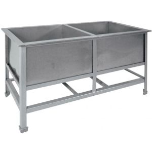 1200х630х850мм, Две сварные емкости размером 530х530х400 из нержавещей стали марки AISI 304 толщиной 0,8мм. Каркас сварной из уголка 40х40 толщиной 2мм, покрытого порошковой краской серого цвета, внизу по периметру обвязка. Ванна комплектуется выпуском с нержавеющей решеткой и механическим запорным клапаном, диаметр выпуска 90мм, диаметр подключаемого сифона 50мм, регулируемые опоры. На дне ванны ребра (лучи) для жесткости и снижения вибрации. Ванна поставляется в собранном виде.