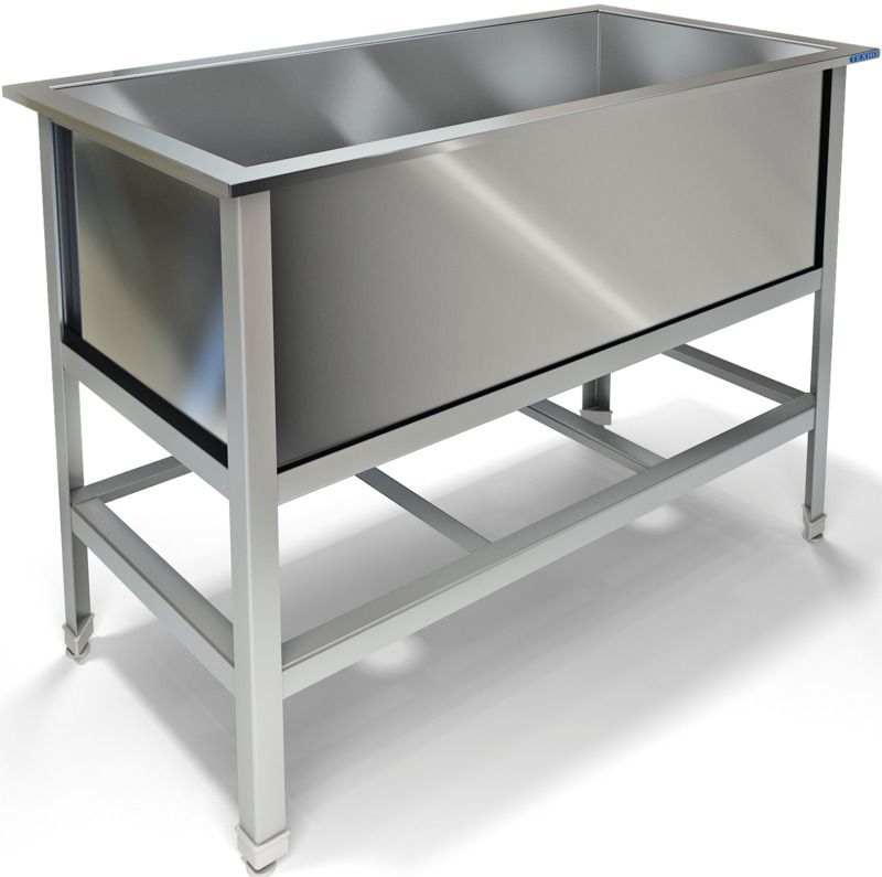 1540х800х850мм, Одна емкость сварная размером 1440х700х450 из нержавеющей стали марки AISI 304 толщиной 0,8мм. Каркас сварной из уголка 40х40 нержавеющей стали марки AISI 430 толщиной 2мм, внизу по периметру обвязка. Ванна комплектуется выпуском с нержавеющей решеткой и механическим запорным клапаном, диаметр выпуска 90мм, диаметр подключаемого сифона 50мм, регулируемые опоры. На дне ванны ребра (лучи) для жесткости и снижения вибрации. Ванна поставляется в собранном виде.