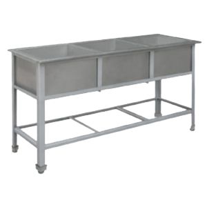1800х600х850мм, Три цельнотянутые емкости размером 500х400х250 из нержавеющей стали марки AISI 304 толщиной 1мм, обнижение 2мм. Объемный пристенный борт высотой 70мм. Каркас сварной из уголка 40х40 толщиной 2мм, покрытого порошковой краской серого цвета, внизу по периметру обвязка. Ванна комплектуется выпуском с нержавеющей решеткой и механическим запорным клапаном, диаметр выпуска 90мм, диаметр подключаемого сифона 50мм, перелив, регулируемые опоры. На дно ванны нанесена виброшумоизоляция. Ванна поставляется в собранном виде.