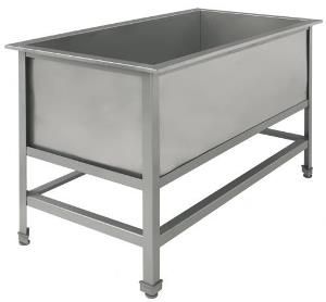 1000х530х850мм, Одна емкость сварная размером 900х430х300 из нержавеющей стали марки AISI 304 толщиной 0,8мм. Каркас сварной из уголка 40х40 толщиной 2мм, покрытого порошковой краской серого цвета, внизу по периметру обвязка. Ванна комплектуется выпуском с нержавеющей решеткой и механическим запорным клапаном, диаметр выпуска 90мм, диаметр подключаемого сифона 50мм, регулируемые опоры. На дне ванны ребра (лучи) для жесткости и снижения вибрации. Ванна поставляется в собранном виде.