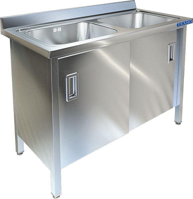1200х600х850мм, Две цельнотянутые емкости размером 500х400х250 из нержавеющей стали марки AISI 304 толщиной 1мм, обнижение 15 мм. Объемный пристенный борт высотой 70мм. Корпус сварной из нержавеющей стали марки AISI 304 толщиной 0,8мм. Двери-купе, полка. Ванна комплектуется выпуском с нержавеющей решеткой и механическим запорным клапаном, диаметр выпуска 90мм, диаметр подключаемого сифона 50мм, перелив, регулируемые опоры. На дно ванны нанесена виброшумоизоляция. Ванна поставляется в собранном виде.